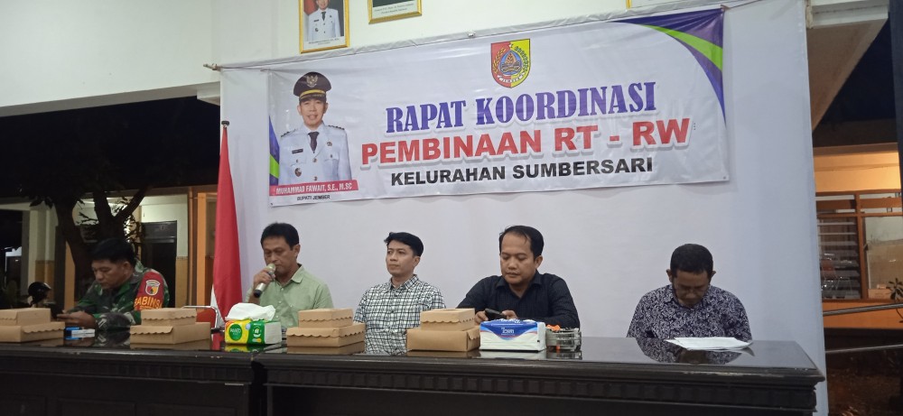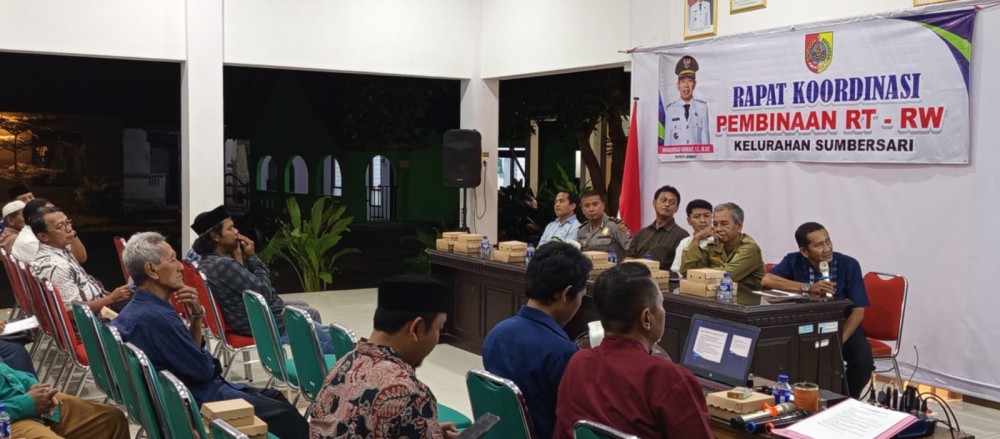 Sumbersari – Pemerintah Kelurahan Sumbersari menggelar kegiatan Rapat Koordinasi Pembinaan RT Dan RW yang berlangsung di Pendopo Kelurahan Sumbersari dalam dua sesi. Kegiatan ini bertujuan untuk memperkuat koordinasi, meningkatkan pembinaan, serta mempererat sinergi antara pemerintah kelurahan dengan pengurus RT dan RW.
